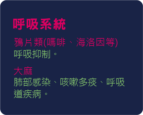 毒品會影響人體的四大系統:神經系統、血液循環系統、呼吸系統跟泌尿系統產生病變使健康受損,吸毒過量將會導致急性中毒嚴重者當場死亡,科技部委託台大公衛學院執行的研究發現吸毒者死亡風險是同齡者的 5-6 倍,住院比率更是一般人 10 倍以上。如果吸毒者使用靜脈注射毒品,可能感染 B 肝、C 肝、愛滋病等血液傳染疾病,讓死亡率大為提升。